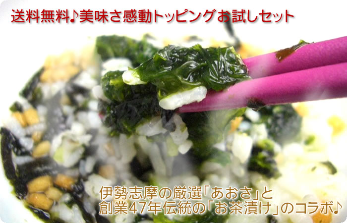 感動で思わず叫ぶ!お茶漬け最強のトッピング3種類セット♪【送料無料】 価格: 2,130円 レビュー評価: 4.67 レビュー数:6 最強のトッピングセット! お客様の声 東京都 山本さん『お世辞抜きで本当に美味しいです♪』 商品説明 お茶漬け海苔の情報 1袋(4食入) 昔ながらの味を護り続け、 品質に妥協することなく 完成された商品です。 懐かしさを感じて下さい。 夜遅くまで仕事・受験などで頑張っているお客様に、 小腹が空いたら 夜食でこの温かくて美味しいお茶漬けはいかがですか? これでまた物事に集中できます!! もっともシンプルなお茶漬け海苔です。 名称 お茶漬け海苔 原材料名 国内産乾海苔、あられ、食塩、調味料(アミノ酸等)、でんぷん、グラニュー糖、抹茶、昆布末、青のり 賞味期限 10ヶ月 保存方法 高温多湿をさけ、冷 Supported by 楽天ウェブサービス |